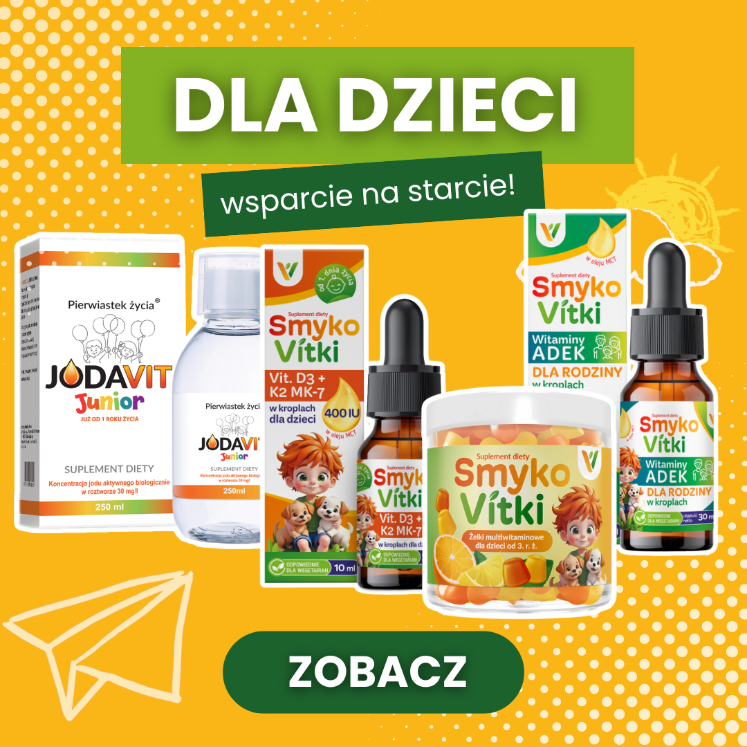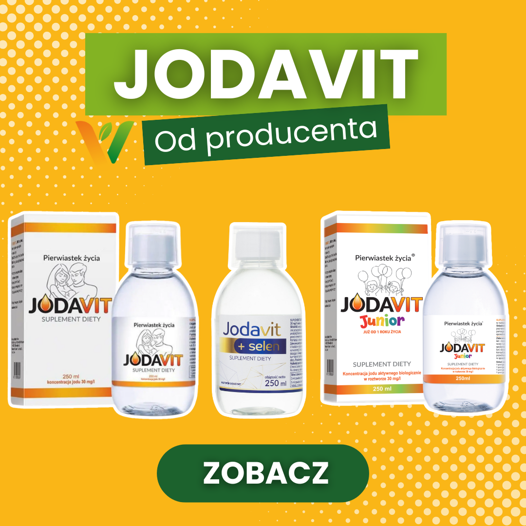 jod Jodavit, bez recepty – wysokiej jakości preparat z jodem w płynnej formie, w bezpiecznej dawce. Nasz produkt wyróżnia nie tylko płynna forma, dużo łatwiejsza w przyjmowaniu od jodu w tabletkach. Jodavit jest bezwonny i nie ma smaku, co jest zaletą szczególnie w przypadku dawkowania u dzieci. Jednak to, co warte uwagi, to jego skład - woda artezyjska i cztery sole jodu: jodek potasu, jodan potasu, jodek sodu oraz jodan sodu. Dzięki temu jest wysoko przyswajalny i stabilny termicznie. Nie powoduje alergii, jego nadmiar jest wydalany z moczem, dlatego nie ma możliwości jego przedawkowania, w przeciwieństwie do innych preparatów jodowych. Planujesz ciążę lub jesteś przyszłą Mamą? Preparaty z jodem to niezbędne suplementy diety dla prawidłowego rozwoju Twojego dziecka. Jod to mikropierwiastek szczególnie istotny podczas ciąży. W czasie ciąży zapotrzebowanie na niego drastycznie wzrasta. Pierwiastek ten jest niezbędny dla prawidłowego rozwoju Maluszka. Jego stosowanie należy rozpocząć już podczas starań o pociechę, aby w momencie poczęcia organizm posiadał jego odpowiednie zasoby. Przyjmowanie jodu w czasie ciąży oraz przed nią ogranicza ryzyko wystąpienia wad rozwojowych u dziecka, przede wszystkim zaburzeń neurologicznych i niedorozwoju umysłowego. Tarczyca, dla której niezbędny jest jod, reguluje również proces laktacji u matki. Produkujemy także inne suplementy diety wspomagające zdrowie tarczycy – jod w kapsułkach oraz jod z dodatkiem selenu, polecany szczególnie mężczyznom. Selen to pierwiastek podnoszący poziom testosteronu u mężczyzn. Zwiększa produkcję spermy i poprawia ruchliwość plemników. Wpływa także pozytywnie na libido oraz erekcję. Co na zmęczenie? Polecamy nasz Magnetovit – suplement diety z magnezem i wapniem, który zadba o twoje mięśnie, kości i koncentrację. Zajrzyj do naszej kategorii ZDROWIE, aby poznać pozostałe suplementy diety, takie jak minerały Schindele, bestsellerowy wyciąg z mniszka lekarskiego, czy najsilniejszy na świecie antyoksydant OPC – ekstrakt z pestek winogron.